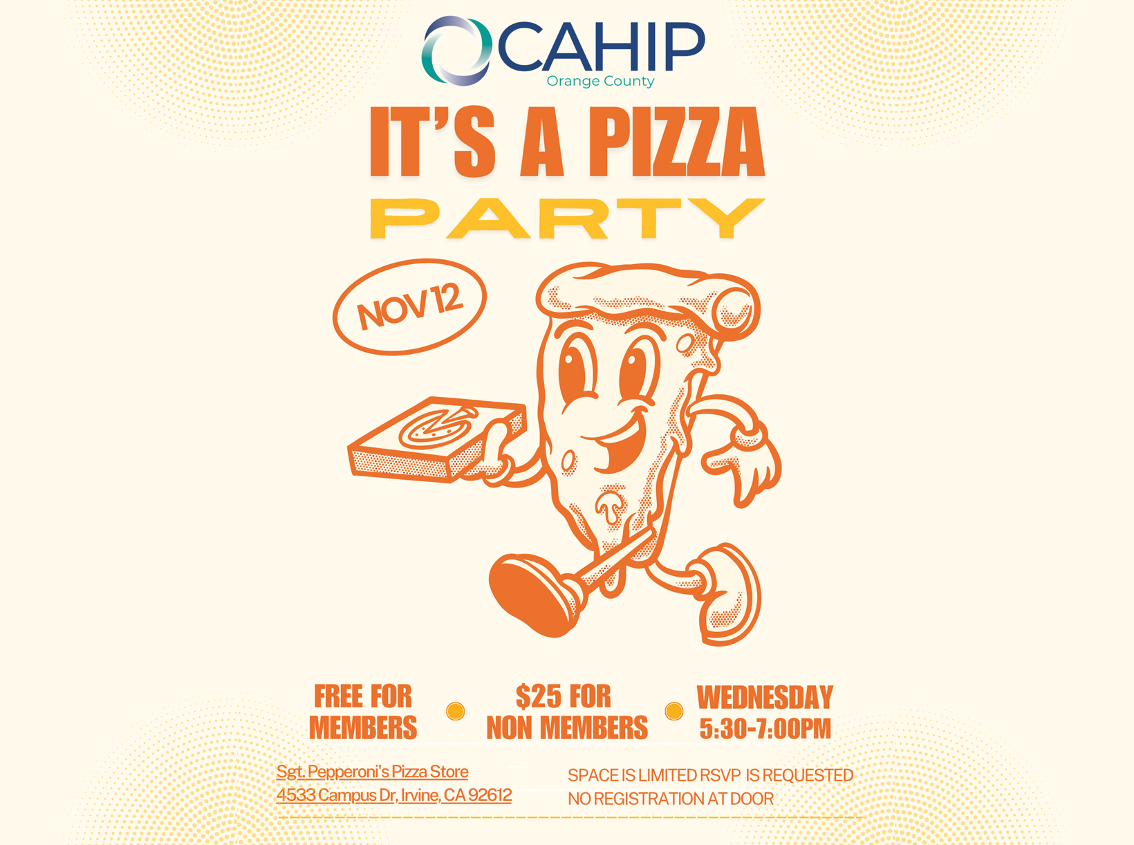 Get ready for a fun-filled CAHIP-OC pizza party! It’s the ideal time to mingle, meet fellow members, and enjoy some tasty pizza. Whether you’re a long-time member or new to the association, this casual gathering is perfect for building connections, sharing ideas, and strengthening our community. Come for the pizza, stay for the great company and conversation!